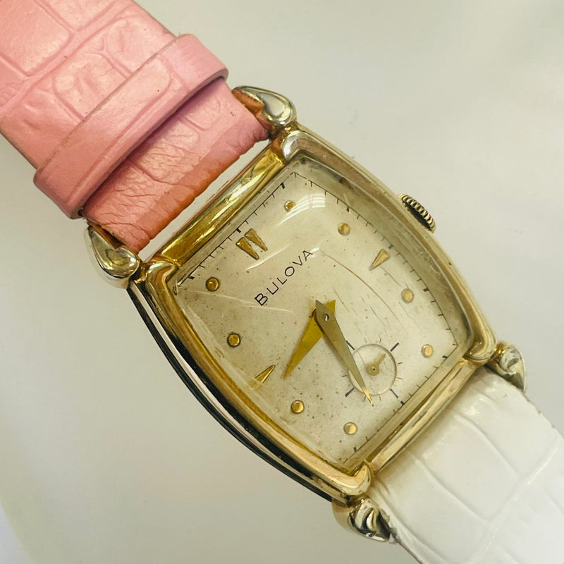 This vintage Bulova wrist watch is perfect for timeless style and function. The 26mm case is finished in yellow gold fill and is accompanied by a white and pink leather strap for a comfortable fit on wrists 6.5-8.5 inches in size. Working condition and recently serviced, it's a perfect, reliable accessory.