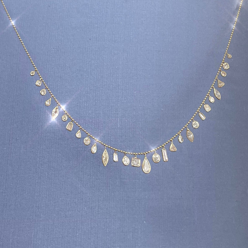 4.8CT Multi Shape Dangling Diamond Fringe 16” 18K Yellow Gold Necklace Heart Pear Trillion Old Mine Cut Marquis Emerald Princess