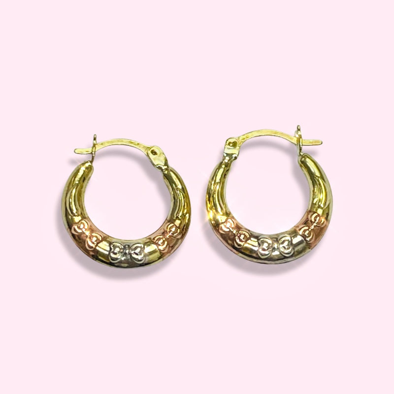 .65” 10K Tritone Rose White Yellow Gold Tapered Puffy Bows Hoop Earrings