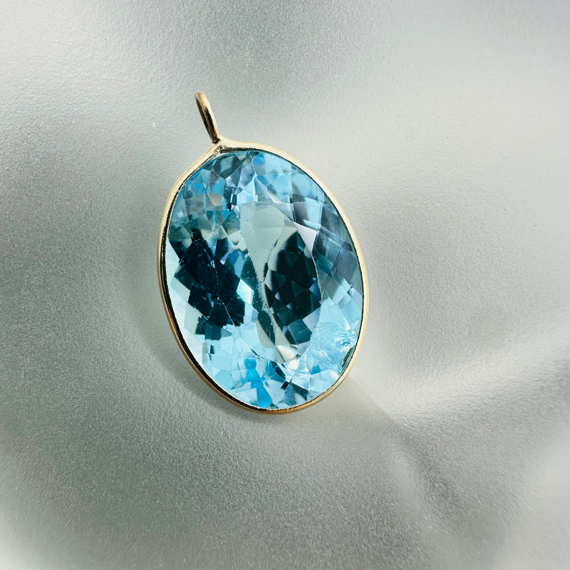 Exquisite Blue Topaz Pendant in 14K Yellow Gold, featuring a lustrous oval shape. Elevate your style with this luxurious and exclusive addition to your jewelry collection.