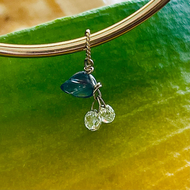 Natural Briolette diamond drops, a glittering pair topped with a deep teal hued spinel leaf