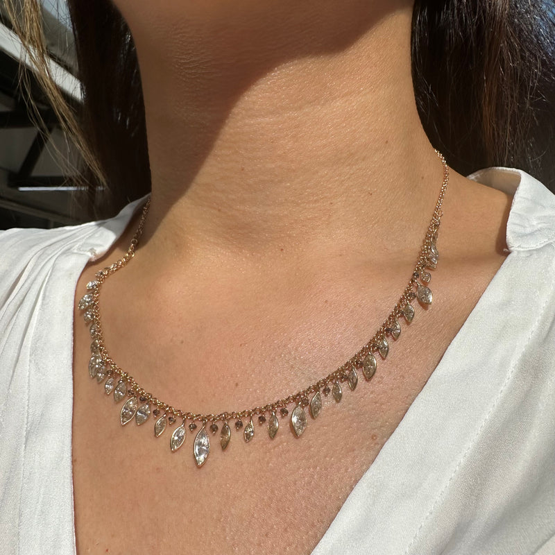 This stunning yellow gold necklace features a stunning display of marquise diamonds hanging from a 18" chain. It's a lovely and sophisticated piece that would elevate any jewelry collection.
