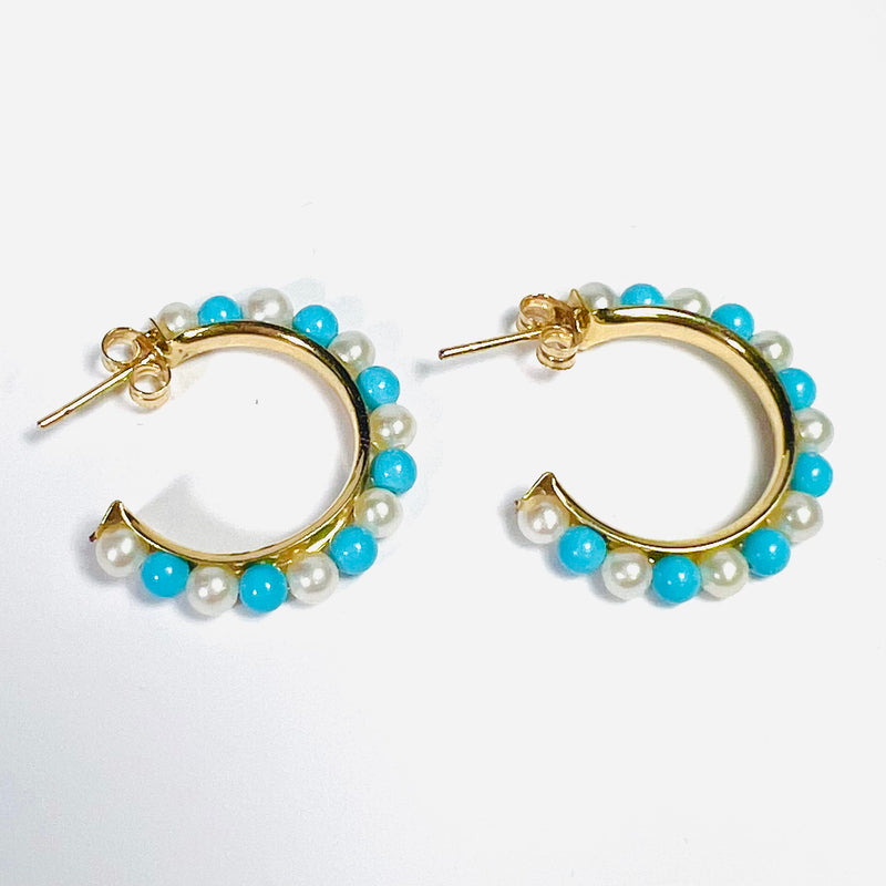 14K Yellow Gold Pearl & Turquoise Half Hoop Earring Studs .90" Sale price$225.00