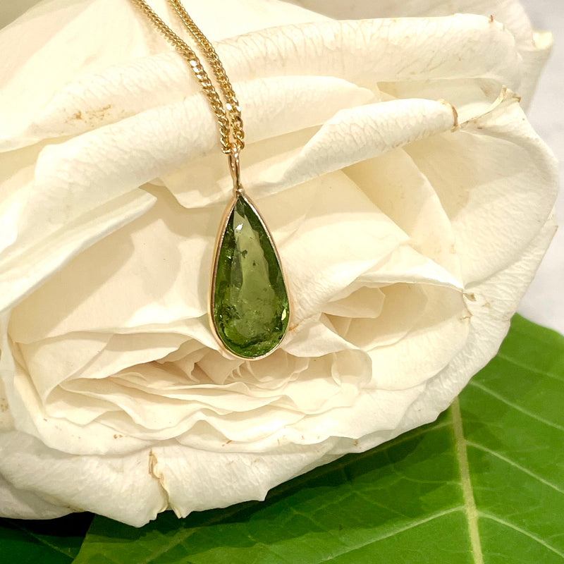 Natural Green Elongated Tourmaline 14K Yellow Gold Pendant Charm 23x9mm