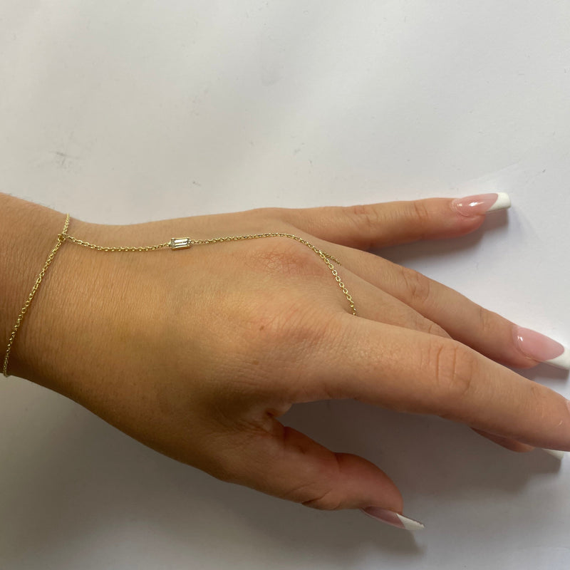This exquisite Long Baguette Diamond Solid 14K Yellow Gold Handchain Bracelet features a 6-inch chain with an extendable length of 6.5 inches. Marked with 14K, this luxurious piece weighs 1.4g, adding a touch of opulence to your ensemble.