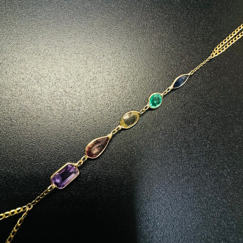Multi Gem 14K Yellow Gold Curb Link Handchain