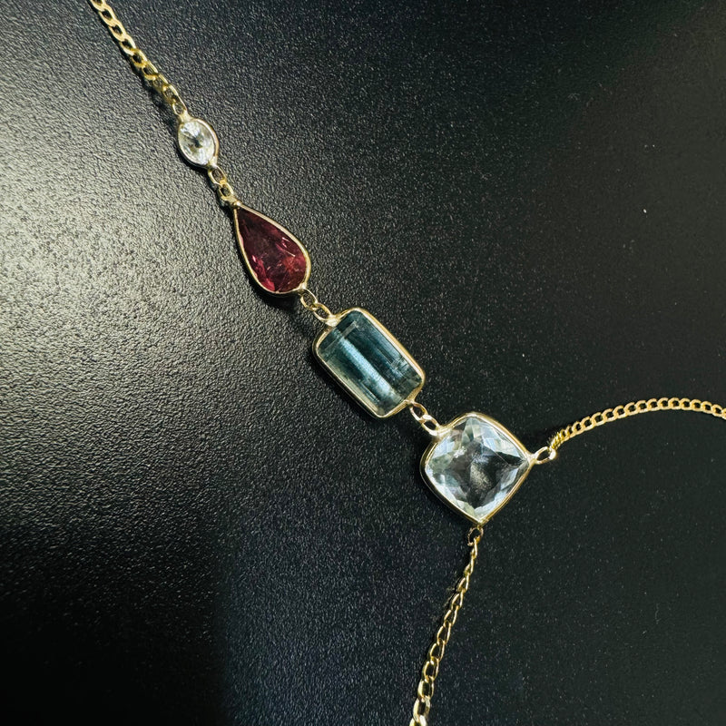 Multi Gem Aquamarine Tourmaline Sapphire 14K Yellow Gold Curb Link Handchain