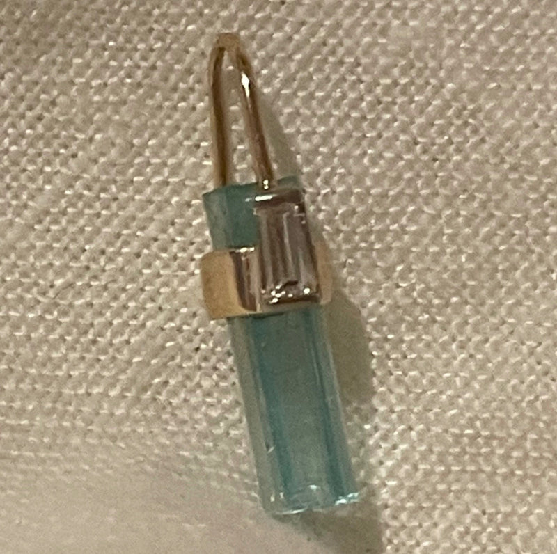 Featuring a natural emerald crystal, light green in hue, set in a handmade 14k gold basket bail and accented with a shimmering tapered baguette diamond.