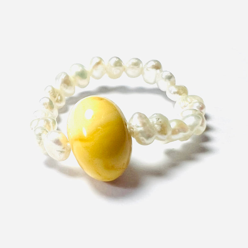 Featuring a 2mm seed pearl ring with 5mm Amber Bead in the center.