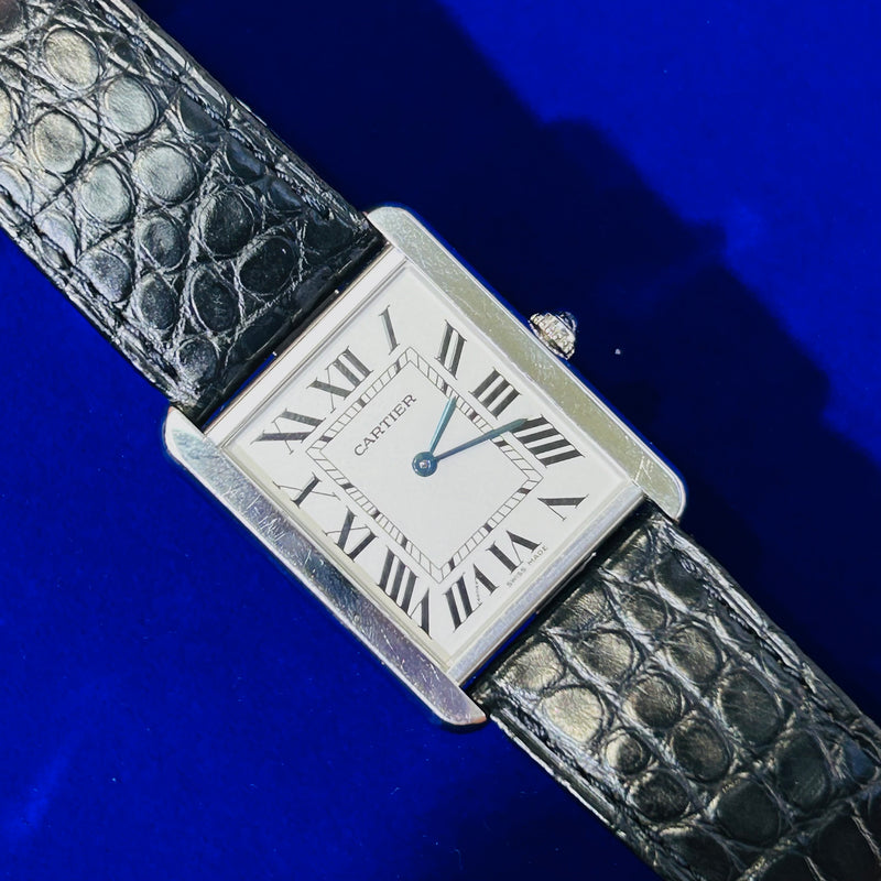 Cartier Stainless Steel Tank Watch with Black Leather Band And Deployment Strap