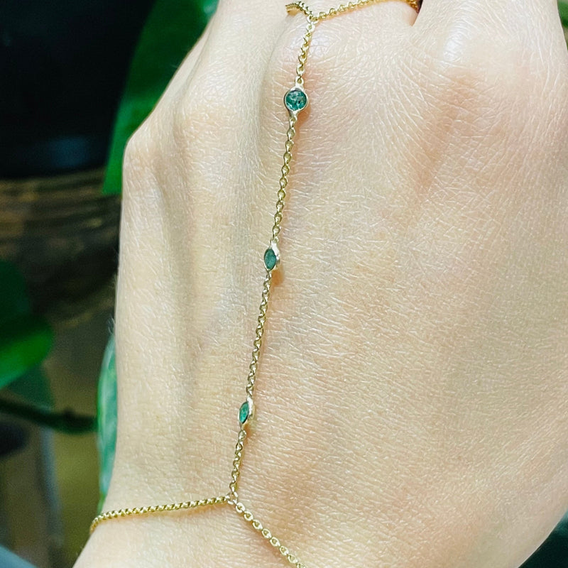 Three Emerald HandChain in solid 14k Yellow Gold