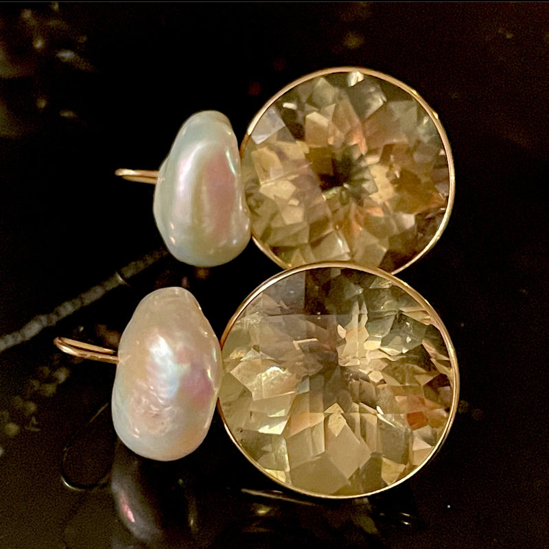 Unique Baroque Pearl and Lemon Quartz 14K Gold Earrings