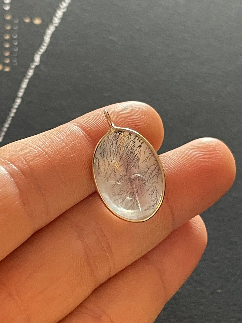 Unique Black and White Dendrite Agate in Solid 14K Yellow Gold Pendant Charm 27x24mm